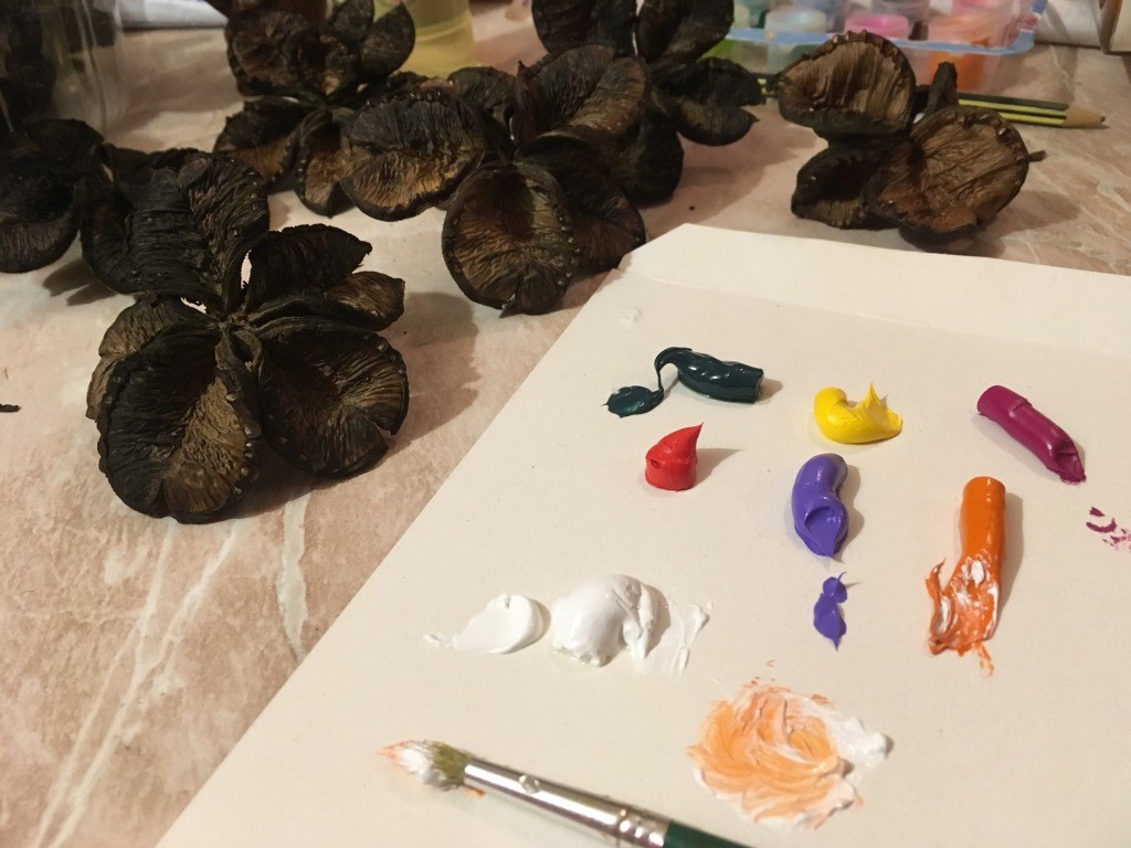 Если не покрасить, то выглядят пионы слишком темными…Первый же мой опыт оказался удачным, поэтому я решила сделать вторую партию цветочков. Тем более, что у меня этих корочек от пионов сохранилось довольно много.