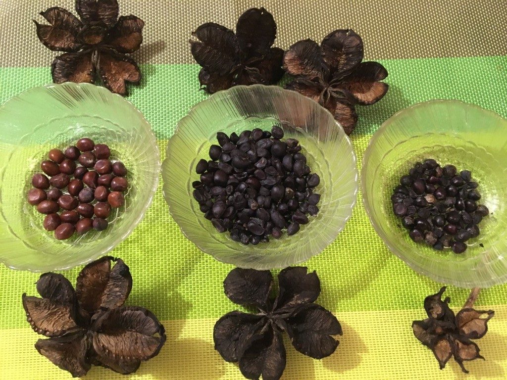 Семена с трех разных кустов древовидных пионовВнутри коробочки ребристые, а с изнаночной стороны — словно бархатные, чуть шершавые. Такой невероятно приятный природный материал.