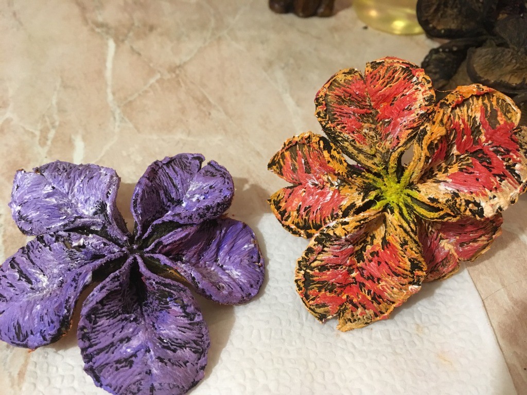 Если не покрасить, то выглядят пионы слишком темными…Первый же мой опыт оказался удачным, поэтому я решила сделать вторую партию цветочков. Тем более, что у меня этих корочек от пионов сохранилось довольно много.