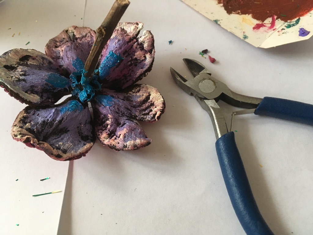Чтобы откусить стебелек, мне понадобились маленькие кусачки, поскольку засохшие стебли становятся прочными как дерево. Ведь и пионы древовидные…Мне хотелось сохранить все трещинки и природную красоту. Все-таки это природный материал, как и шишки.