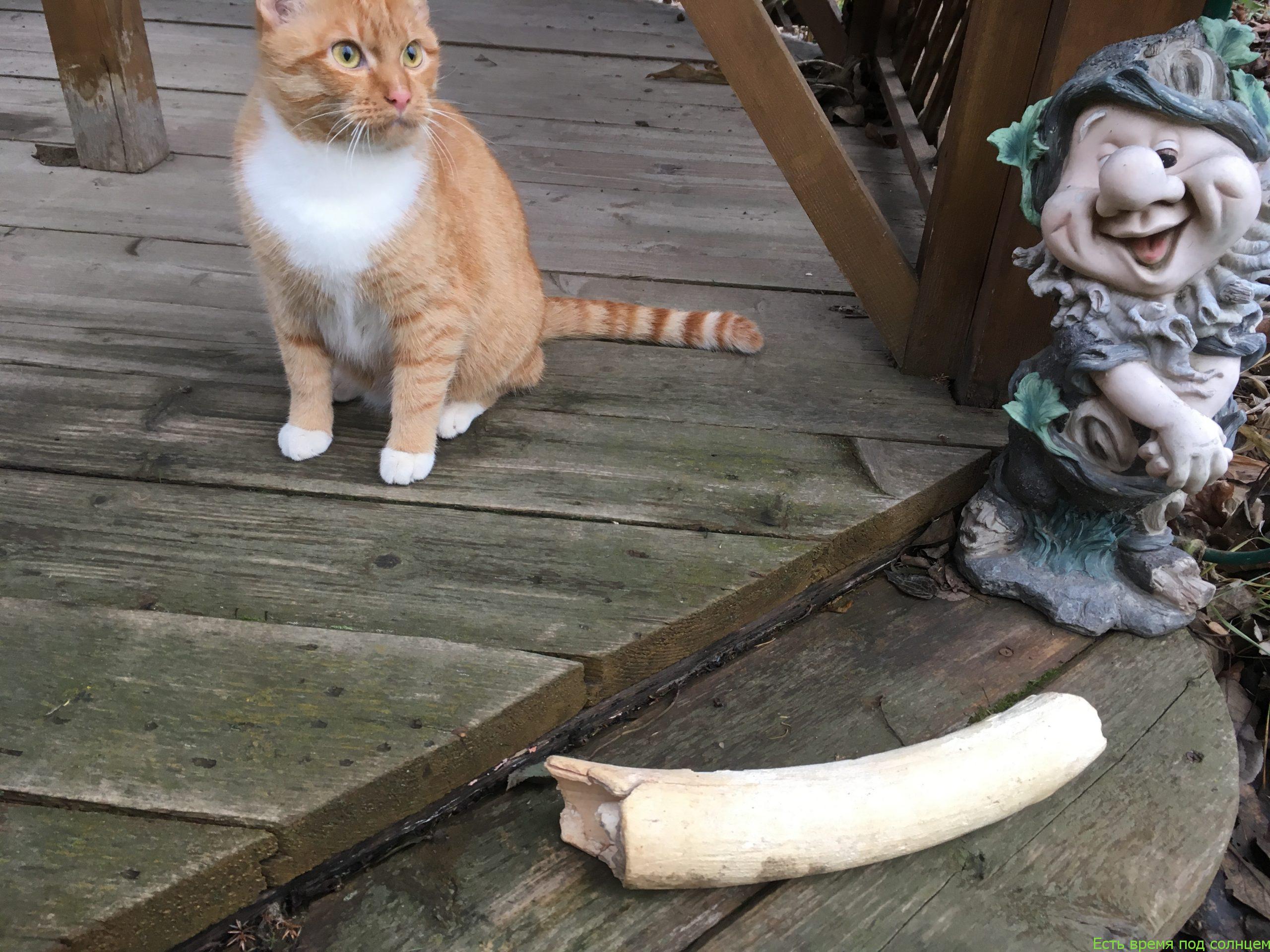 Соседский кот для сравнения с размерами бивня. Фото автора в садовой беседке…