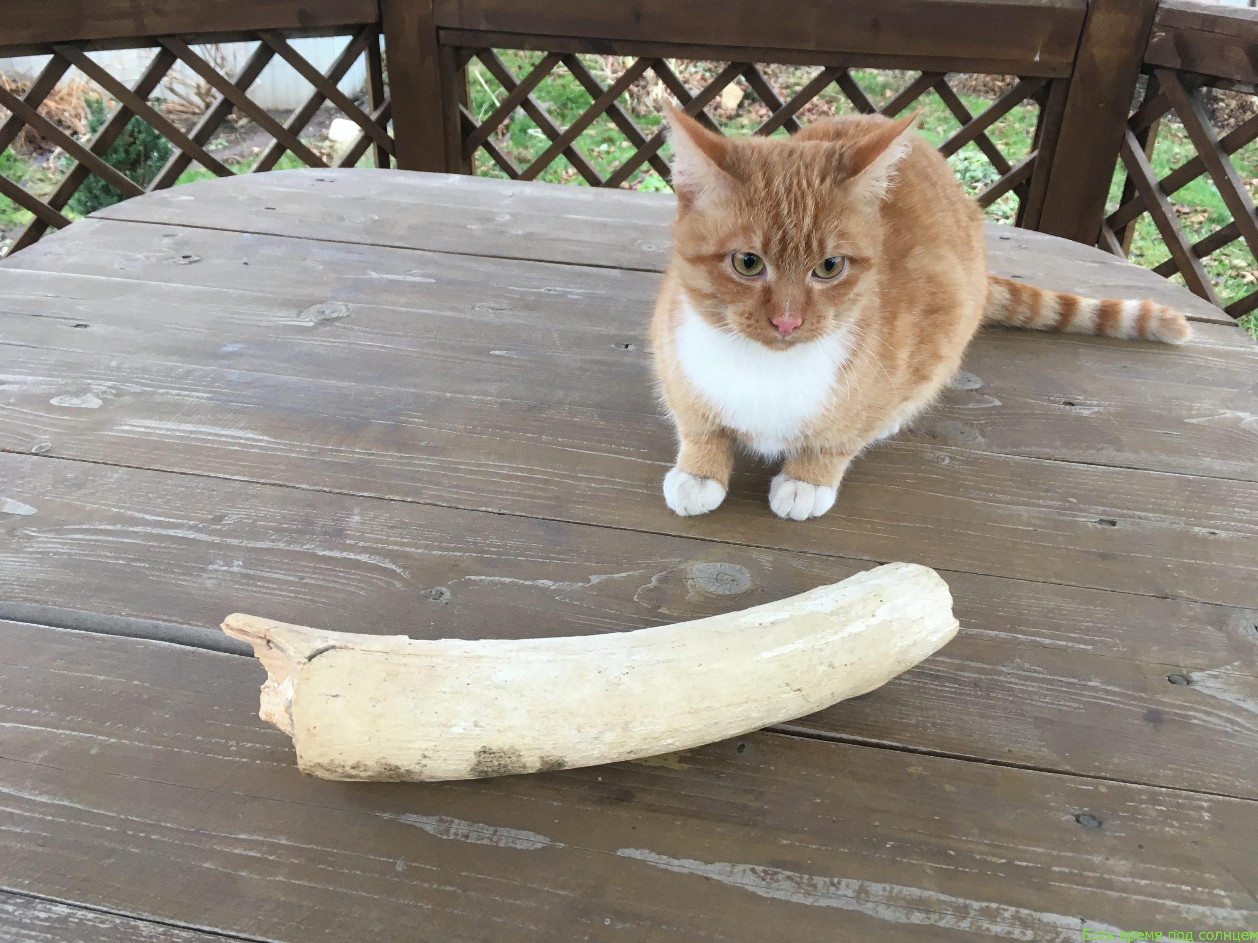 Соседский кот для сравнения с размерами бивня. Фото автора в садовой беседке…