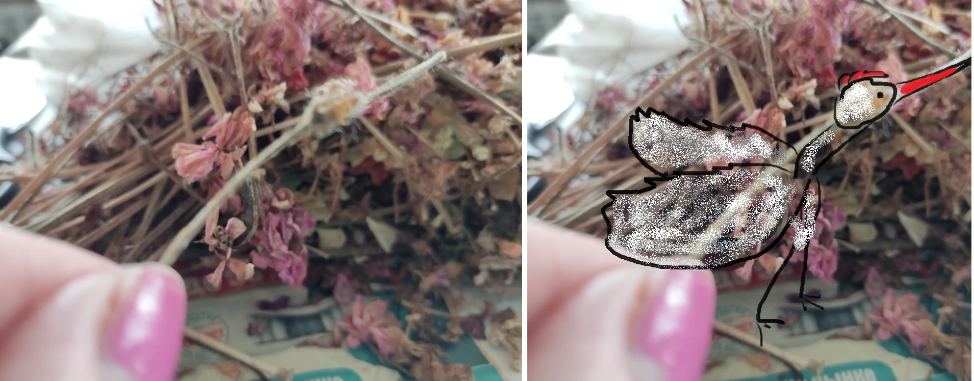 Я взяла коробочку герани с семенами (слева) и пририсовала там птицу с длинным клювом (справа). Видите?