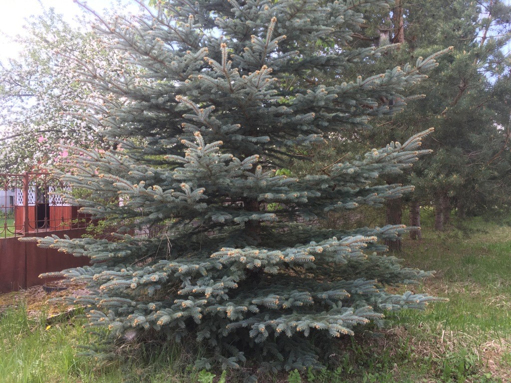 Так теперь выглядит полоса за забором: на первом плане голубая ель, а за ней огромные сосны в ряд. И только если присмотреться, то там видно кустики войлочной вишни между соснами и забором…