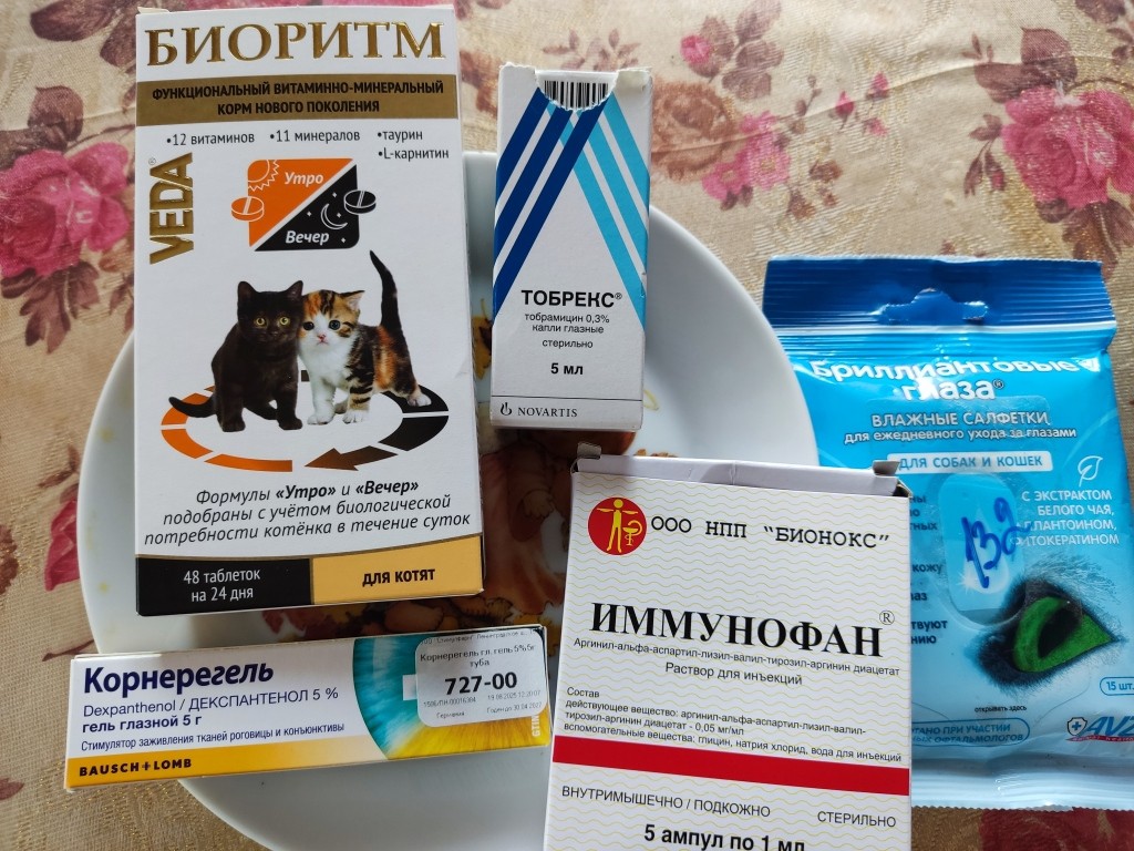 Это были уколы антибиотиков в холку, капли в глазки, витамины и таблетки трижды в день.