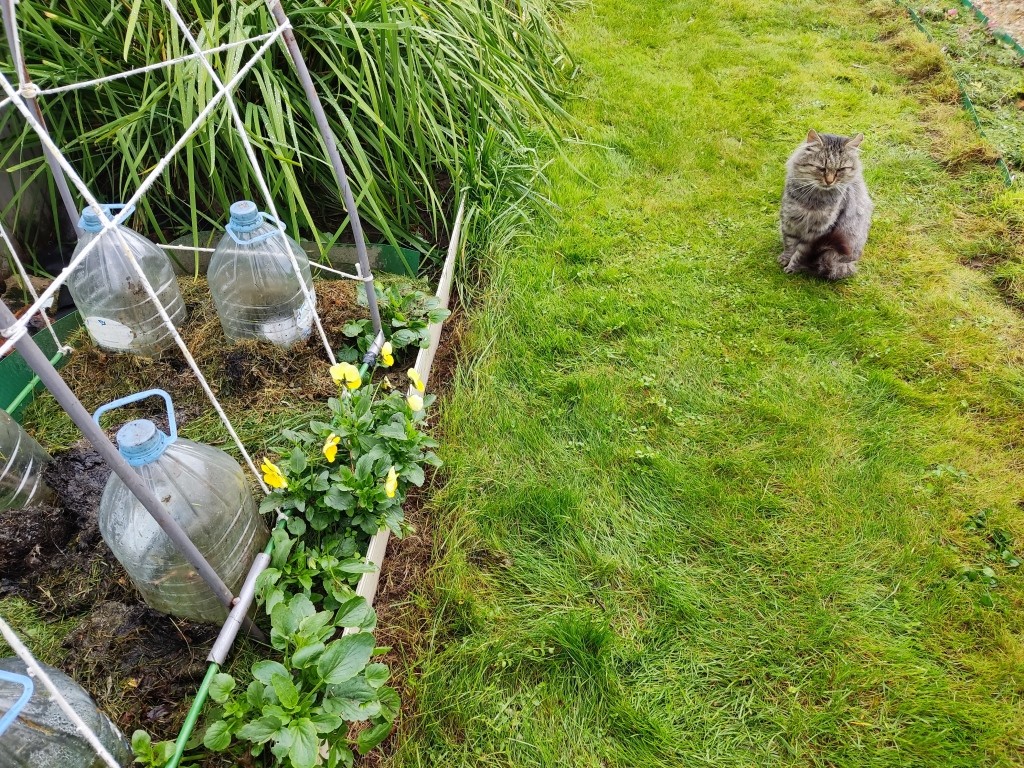 Васька наблюдает за мной, пока я занимаюсь грядками…