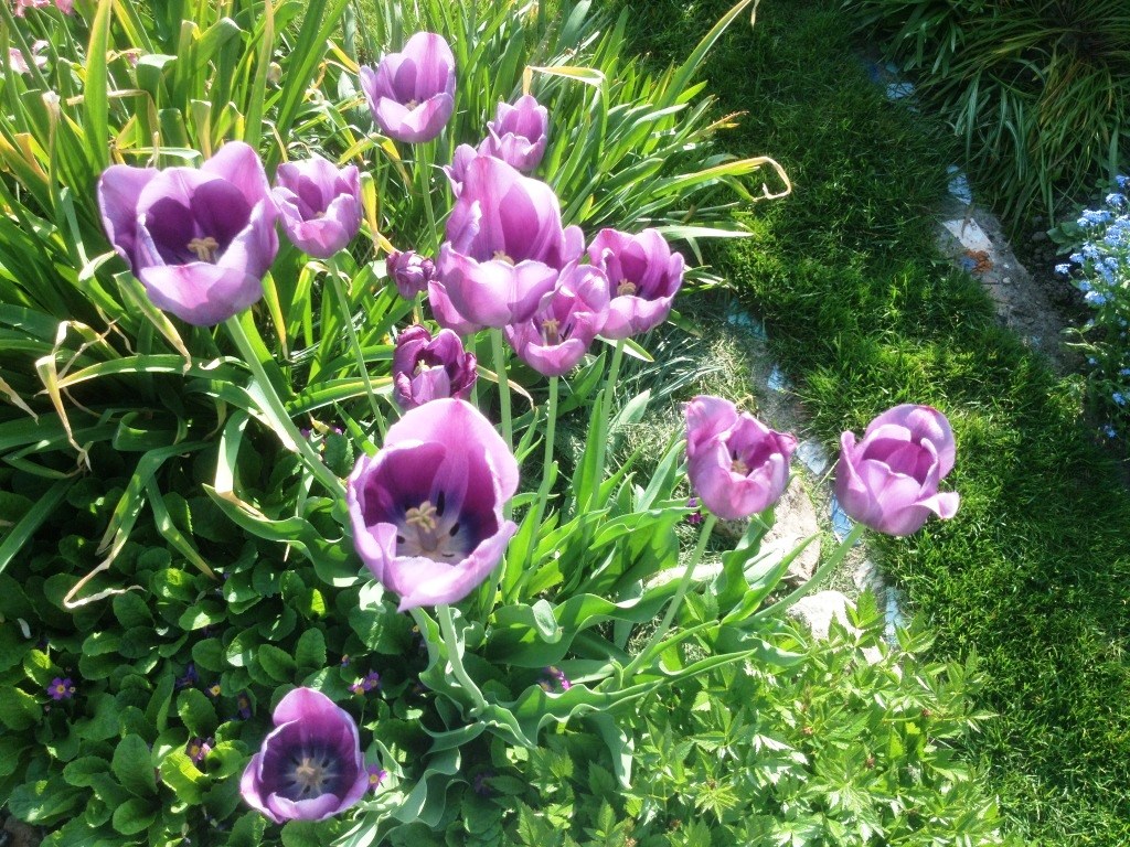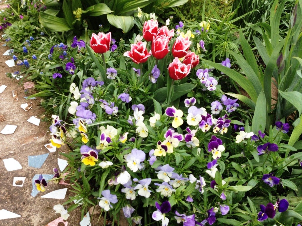 В центре узкая грядка с тюльпанами и пульсатиллой…