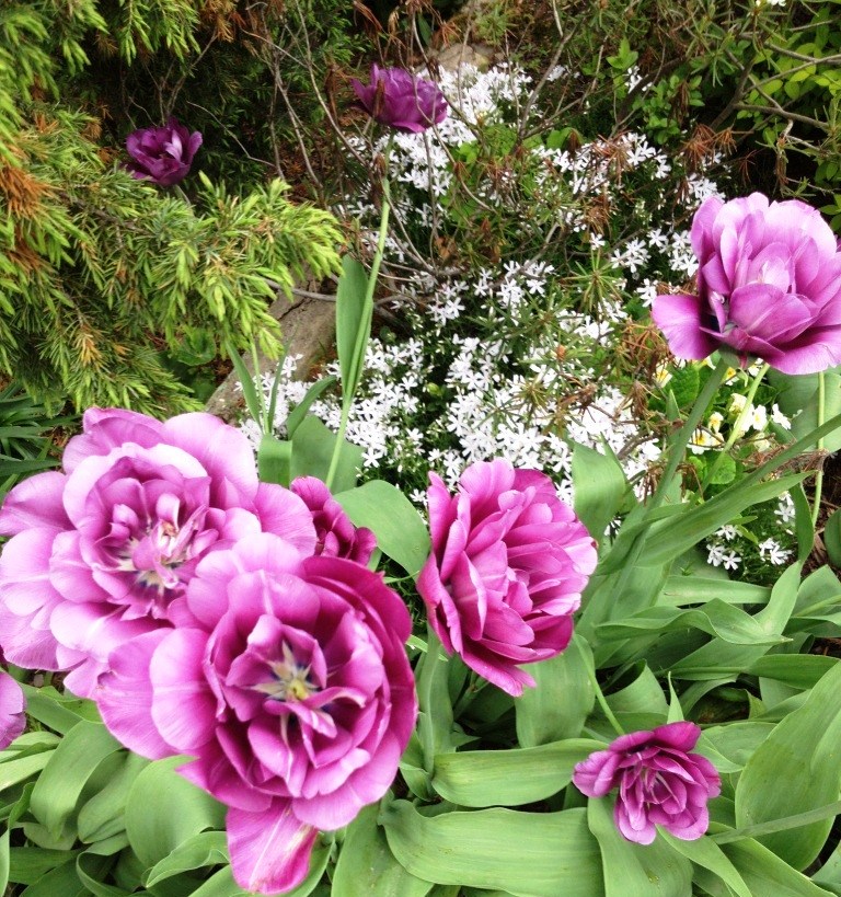 Пример 1: Под можжевельником на кислой почве идеально смотрится тюльпан Блу Спектакл. И белые флоксы шиловидные тут очень кстати.
