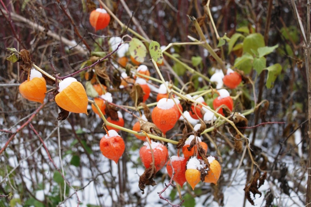 В тот год уже выпал снег, но фонарики физалиса ярко смотрелись в зарослях шиповника…