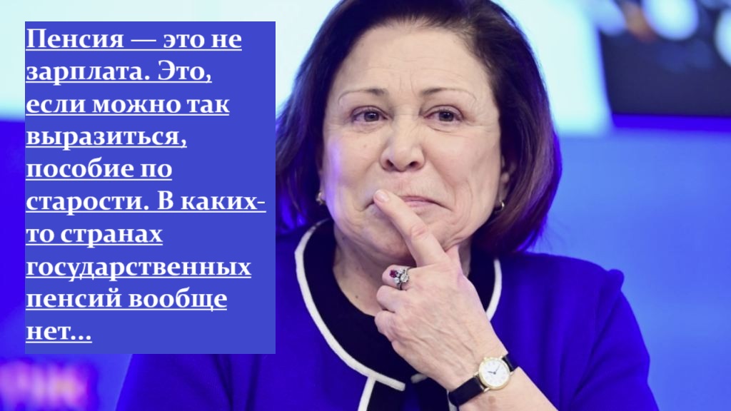 И пояснила так: «Пенсия — это не зарплата, а пособие по старости. И рассчитывать только лишь на пенсию — не стоит!» Да и вообще, дескать пенсия есть не во всех странах…