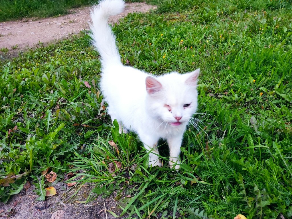 Недавно я рассказала, что во время прогулки часто встречаю белую кошку. Она красивая, но у нее только 1 глаз. Но красивая.