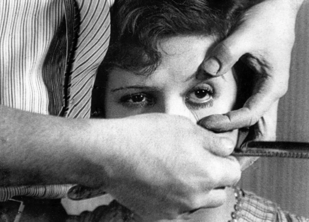 Кадр из фильма, где девушке разрезают бритвой глаз