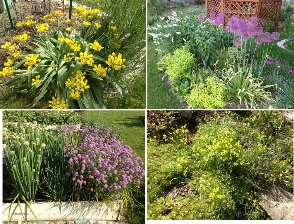 На этом фото внизу слева — многолетний чеснок с плоскими листьями. Ещё на фото несколько видов многолетних луков…