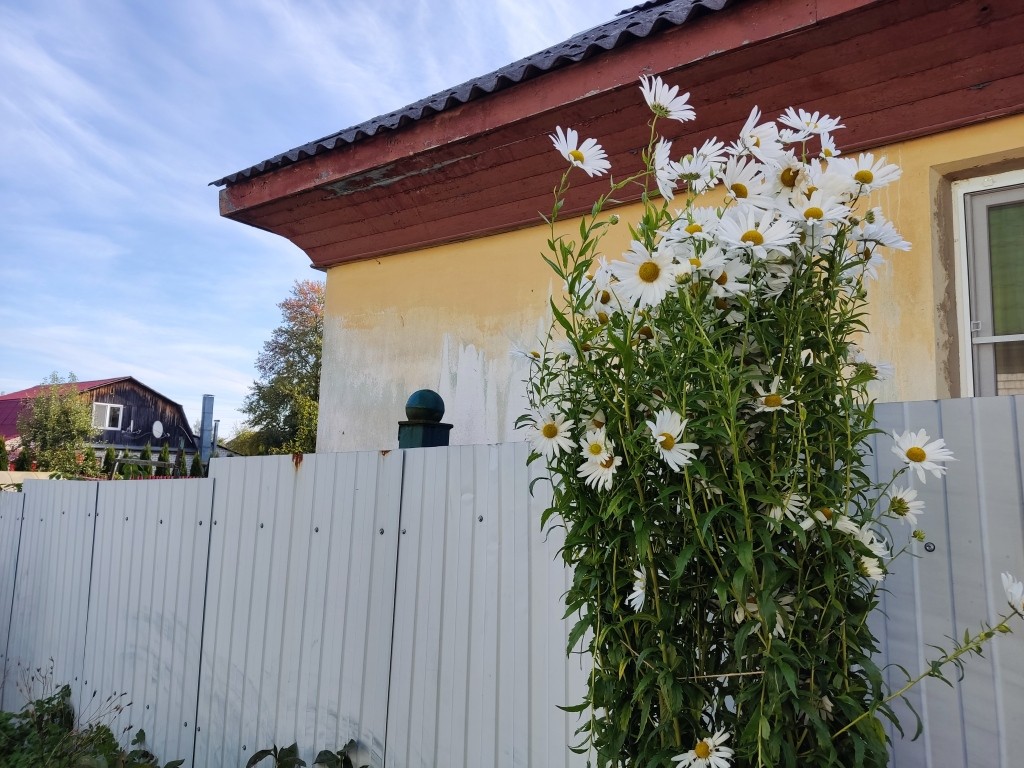 На фото автор хотела показать высокую осеннюю ромашку. Чтобы её показать в полный рост, пришлось в кадр включить и часть соседского дома.