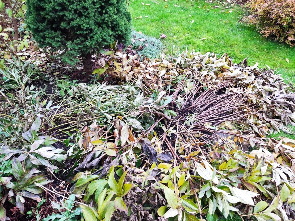 У меня есть знакомая, которая каждую осень пионы обрезает, но побеги не убирает. Она их тут же и оставляет, прикрывая кусты пионов.