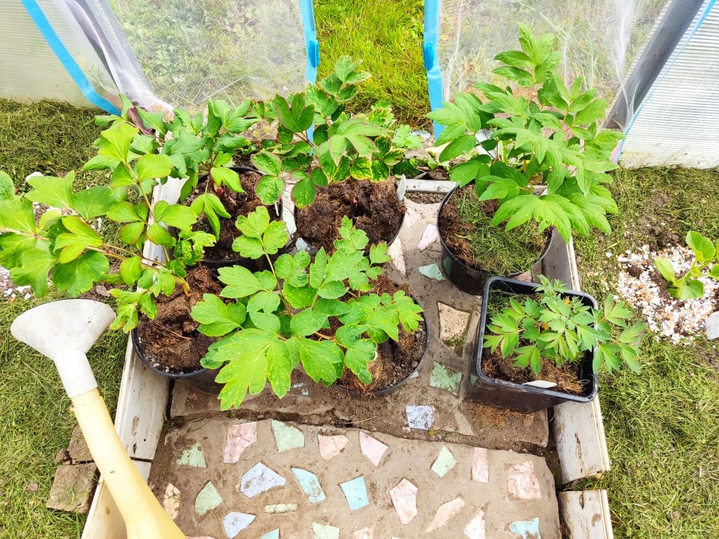 Все пионы я ещё в марте достала из коробок и посадила в большие глубокие горшки. Вот так они стояли в теплице до конца мая: