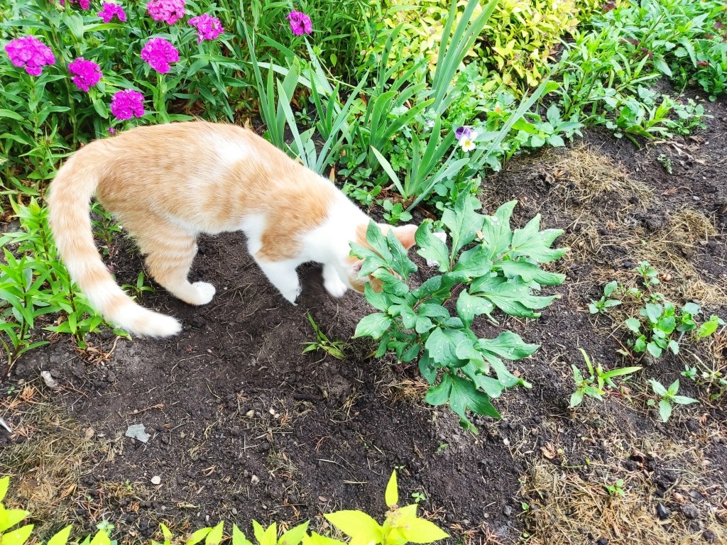 Барсик, который мне «помогал» сажать, впоследствии два пиона сломал, прыгая с можжевельника за птичками и бабочками…