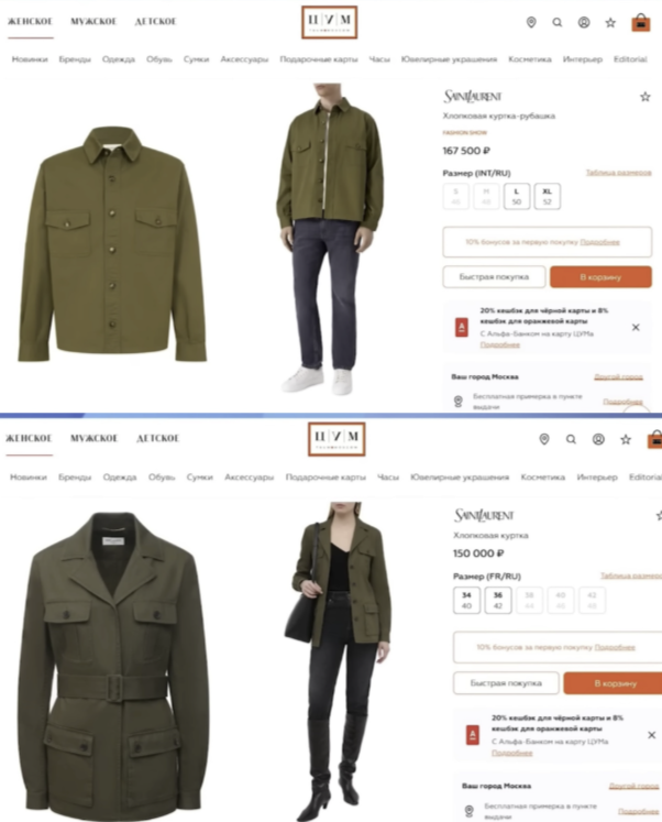 И злые языки сразу заметили, что одежда (смотрите скрин выше) напоминает предложения от фирмы Сен Лоран, где такие зеленые курточки имеют шестизначную цену.