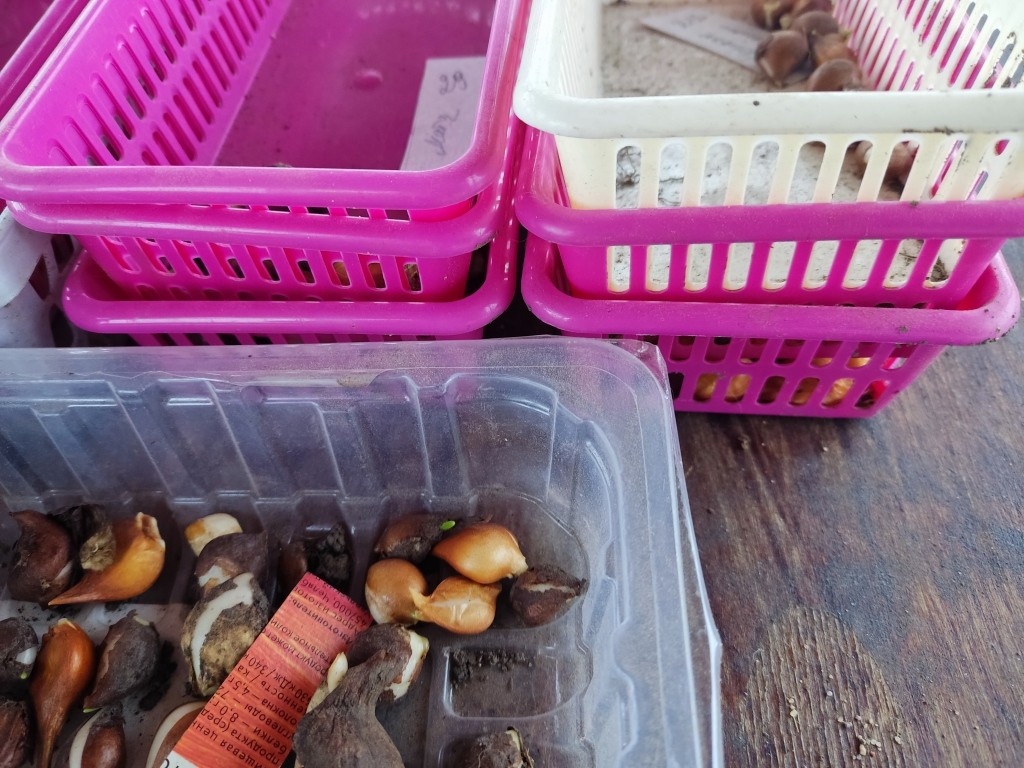 А если поставить в один ряд, то сразу видно, что в каждой корзиночке осталось понемногу тюльпановых деток разных сортов.