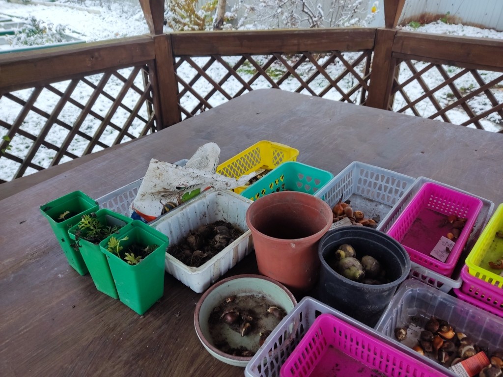Выпал снег, земля замерзла… А в беседке на столе остались детки тюльпанов, которым не нашлось места…