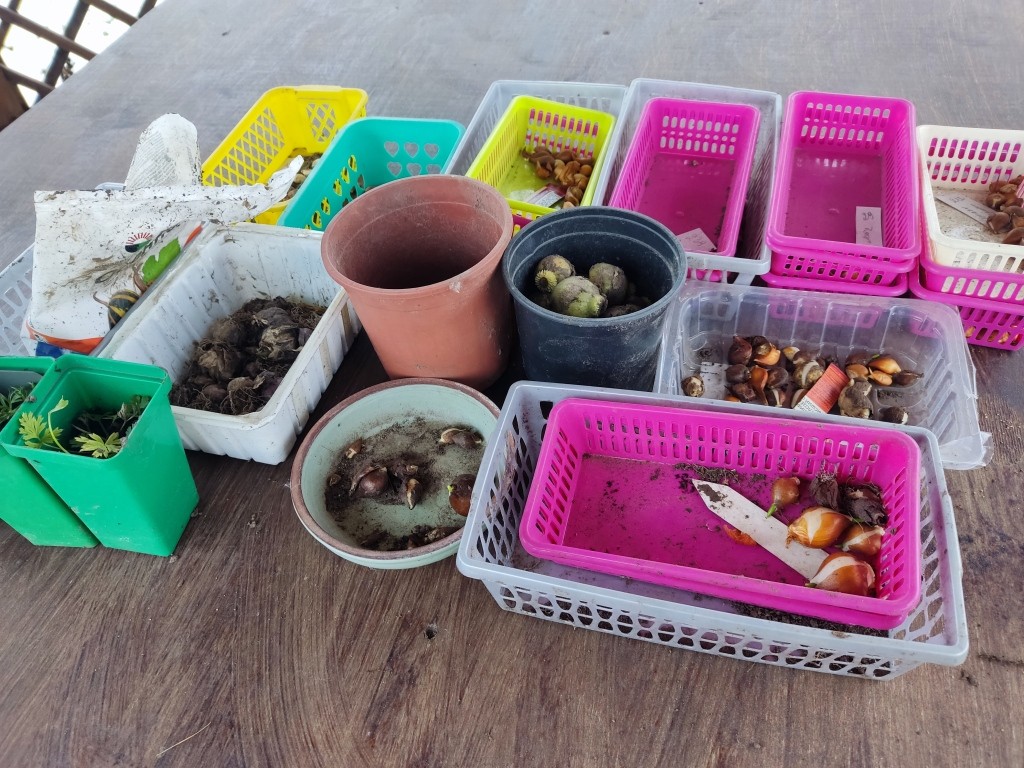 А если поставить в один ряд, то сразу видно, что в каждой корзиночке осталось понемногу тюльпановых деток разных сортов.