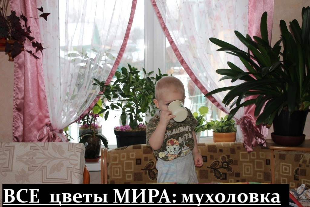 На фото слева направо: Оксилис (кислица), орхидея, лавр, мандарин, фиалки, кливия. Они мух не ловят и детям не интересны… А вот дионея может стать недолгим развлечением… Детей тоже стоит держать от неё подальше