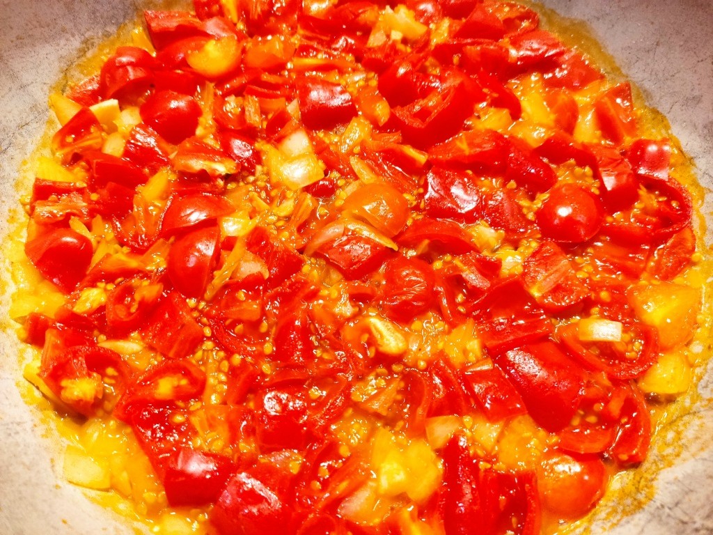 Сначала обжаривает лучок, потом добавляет морковь, сладкий перец и фарш…