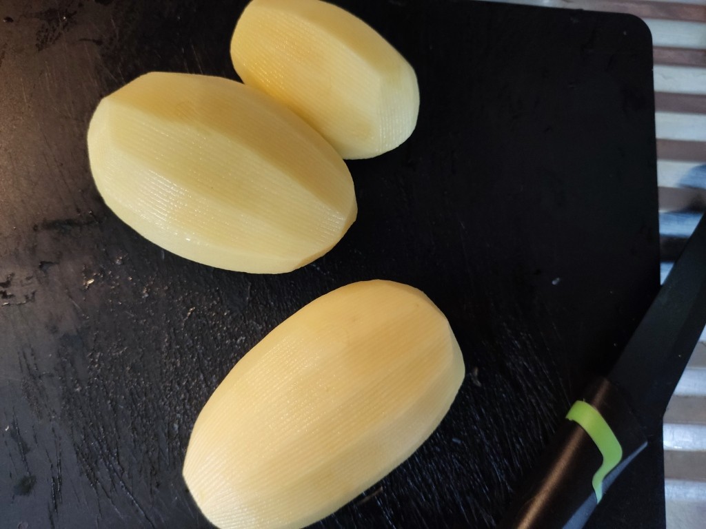 Картошка вот. Лежит ещё в сторонке. Он её только почистил и пока не порезал…