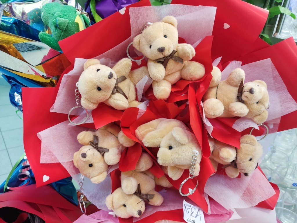 Тут в букете 7 плюшевых мишек. Стоимость букета 1320 рублей. Обратите внимание, что ничего кроме игрушек и упаковочной бумаги в букете нет…
