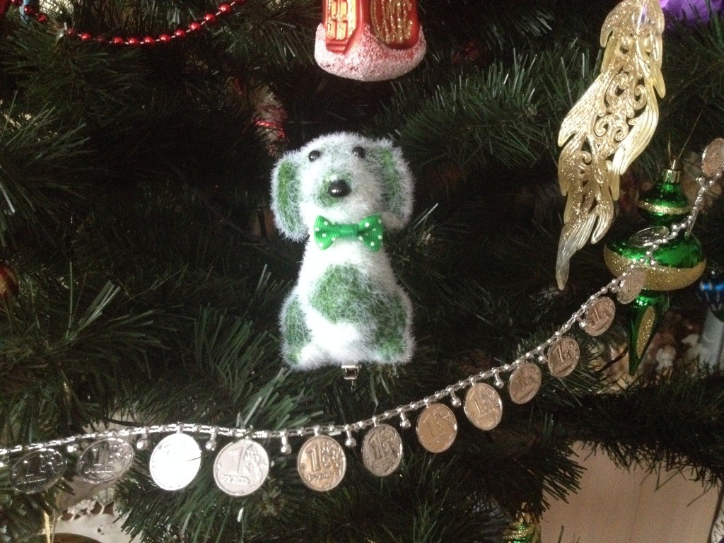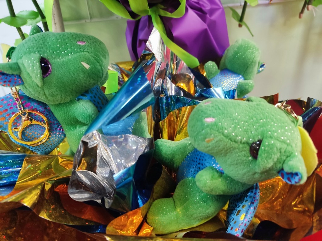 А вот букет из трех игрушечных драконов… Хотя у нас впереди ожидается год лошади, зеленые драконы украсили букет…