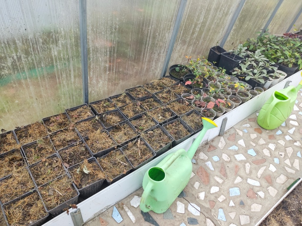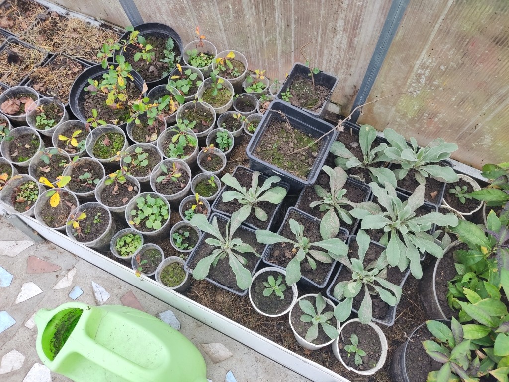 Не успела помыть. Но хотя бы успела в теплицы занести горшки с саженцами и цветами.