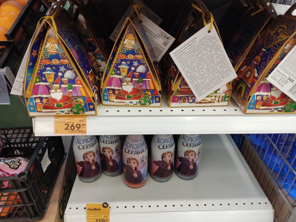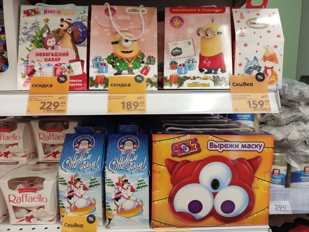 Теперь же там в основном шоколадные конфеты. Вот пример всего одного новогоднего подарка: