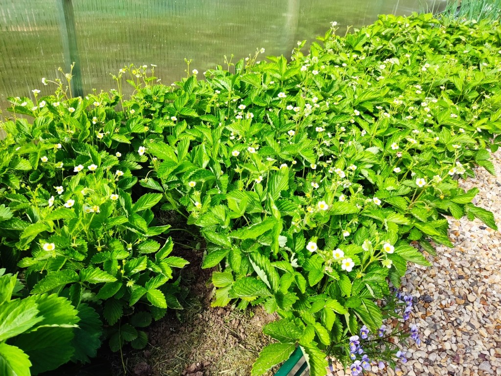 На фото выше моя грядка с белой земляникой. И тут отлично видно, насколько один куст большой и пышный. Это за счет большого изначального количества розеток в каждом кустике.