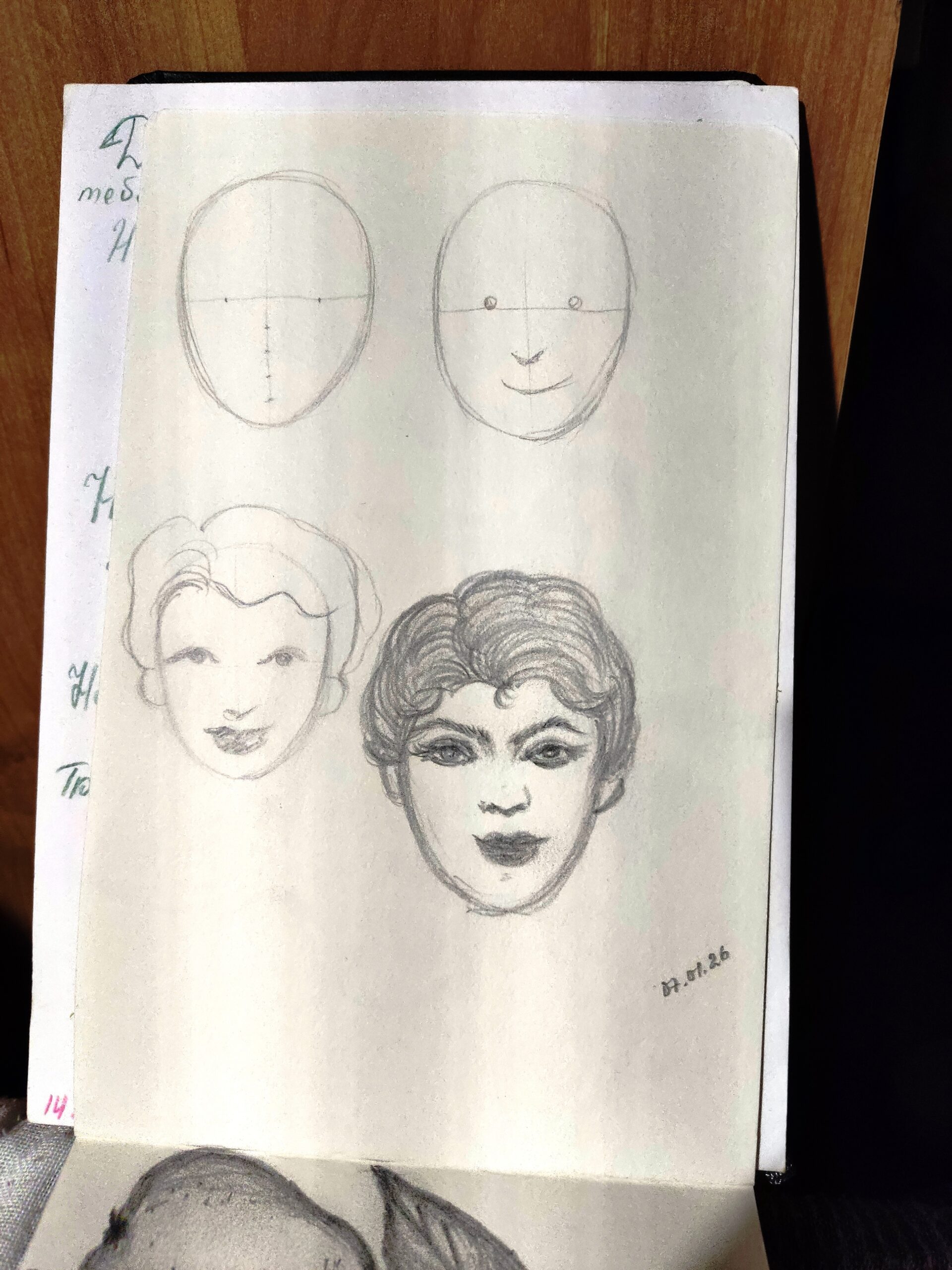 А мне нравится сам процесс. И 7-го я нарисовала два рисунка: училась рисовать лицо человека и грушу на ветке.