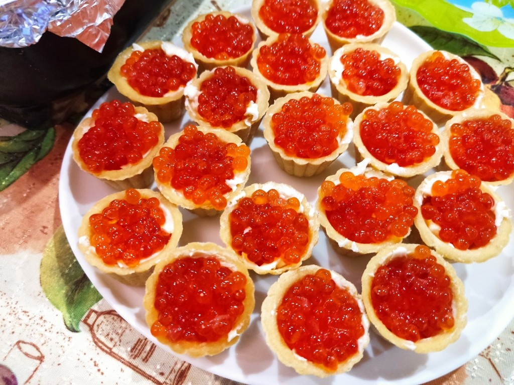 Тарталетки с маслом и икрой. Были ещё три вида тарталеток с разными начинками. И грибы, и курица, а даже ананасы…