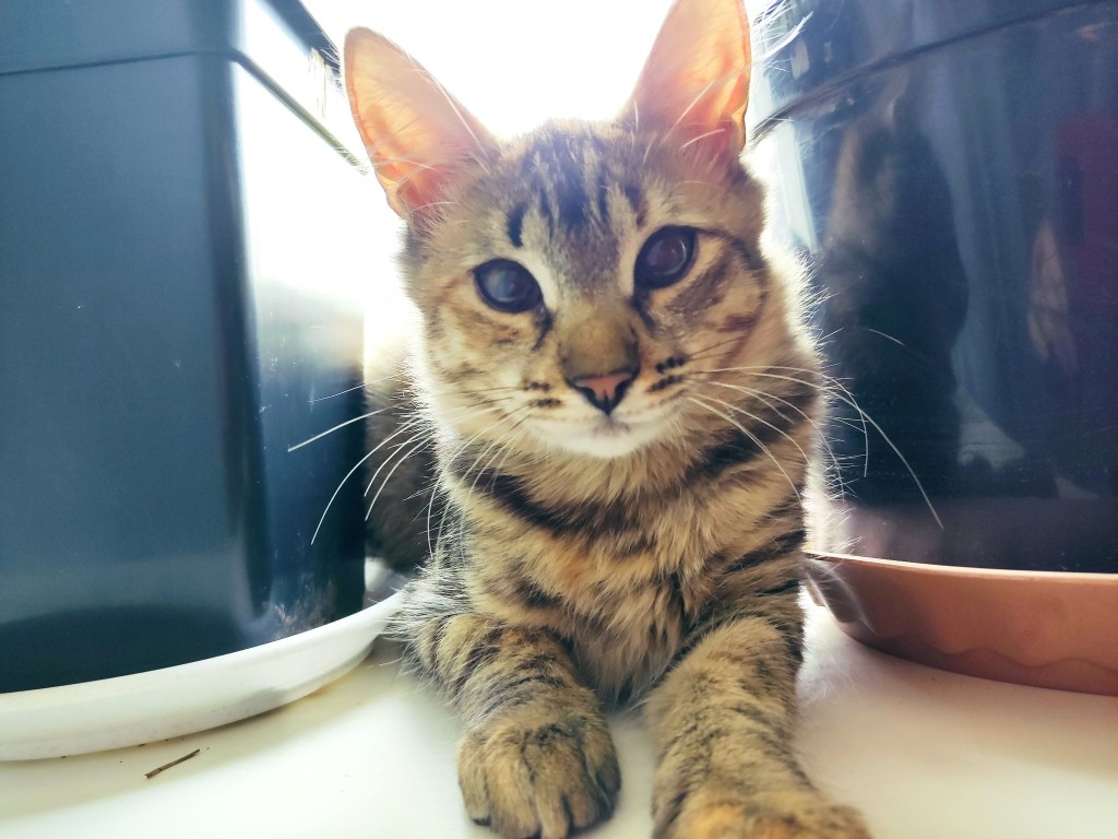 На тот момент, когда Василий притащил к нам своё потомство, котенку было примерно месяц на вид. Или немного меньше, потому что глазки были начального голубоватого цвета. Как почти у большинства котят.
