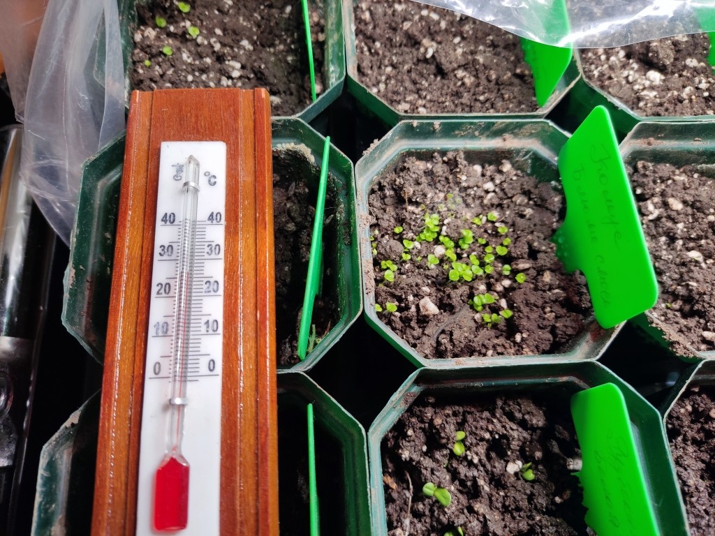 И последнее фото с градусником для понимания. Поскольку всходы появились быстро, то нужно показать и температуру на полочках стеллажа.