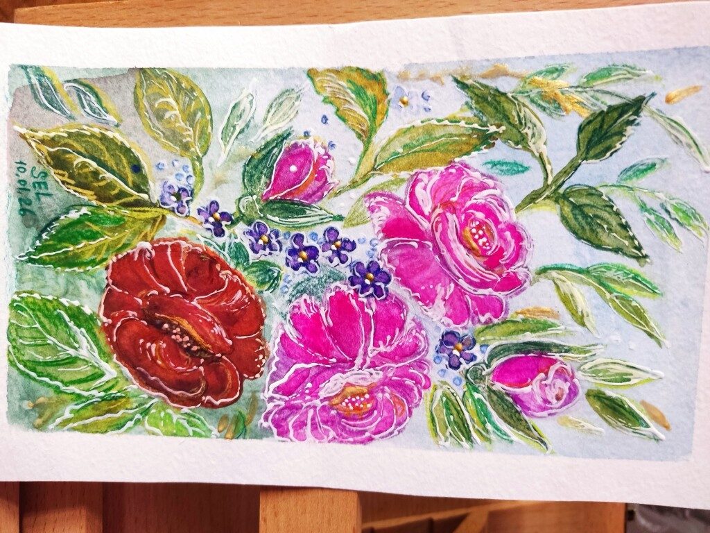 В этом году я решила понемногу рисовать каждый день. И покажу открытку с розами.
