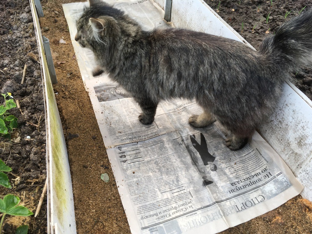 - В прошлом году сделала такие дорожки. Да, травы нет между грядками, НО… Окрестные коты устроили на опилках свой туалет, естественно, все лапами перекопали, опилки, газеты в клочья И ЗАААПАХ…