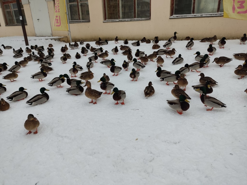 Городской пруд, где эти утки живут обычно, давно замерз. И утки перебрались поближе к людям.