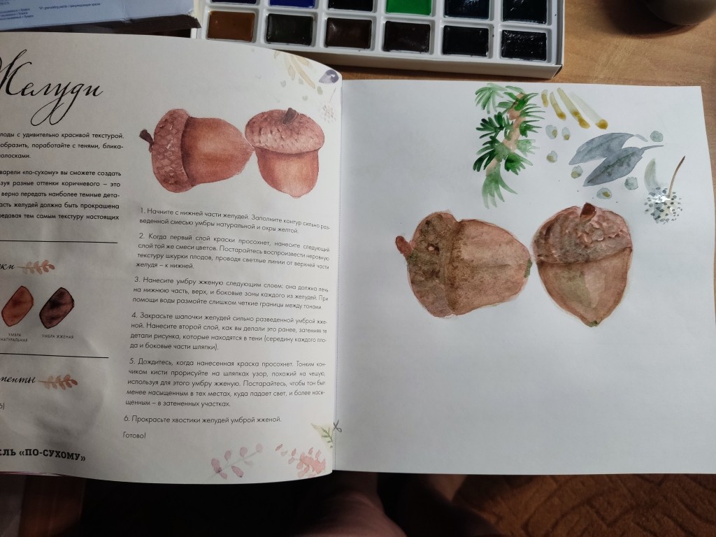 Важное ощущение. Рисуя желуди я впервые почувствовала, что мне нравится акварель. И нравится смешивать краски, подбирая свой оттенок.