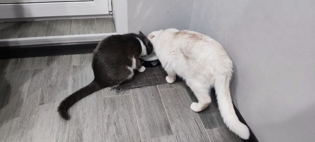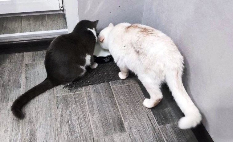 Поставьте в разных углах комнаты три одинаковые миски с привычным кормом. Расстояние в 1.5-2 метра уберет ощущение конкуренции. При этом оставьте и общую миску. Посмотрите, как они отреагируют. Чаще всего коты с удовольствием выбирают совместное питание! Вот ведь как…