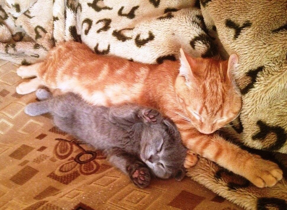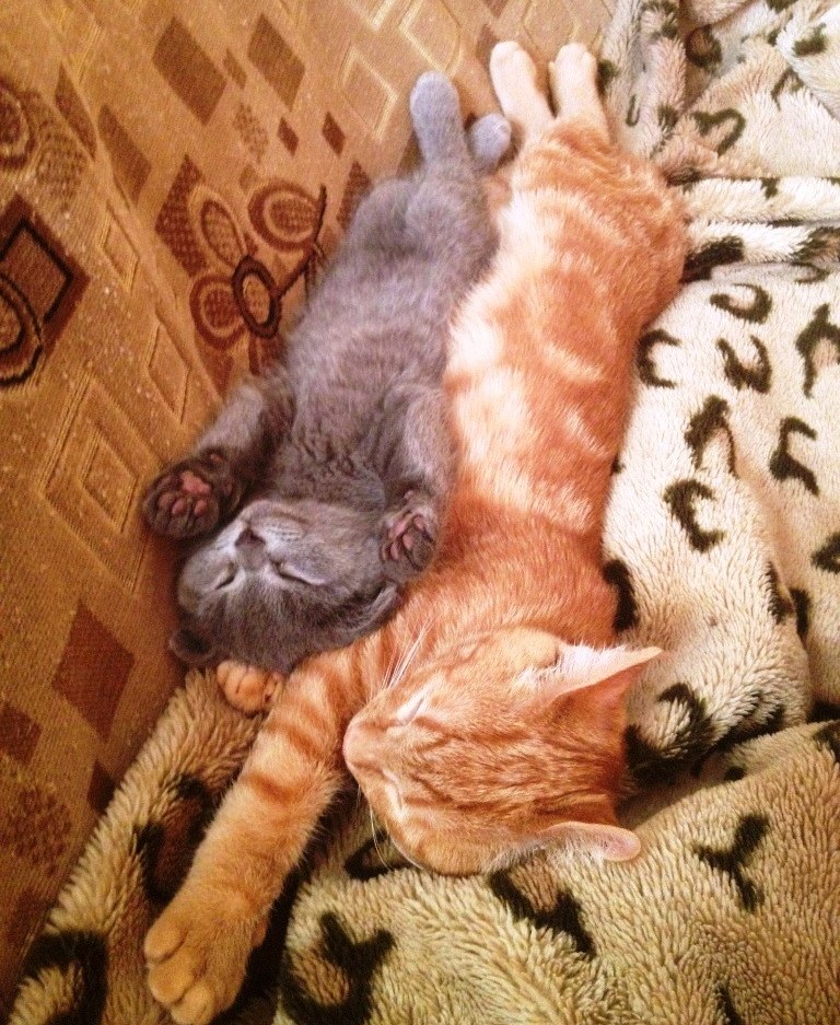 Особенно забавно, если спит один, а второй улёгся под бочок и доверчиво греет спинку возле своего дружочка.