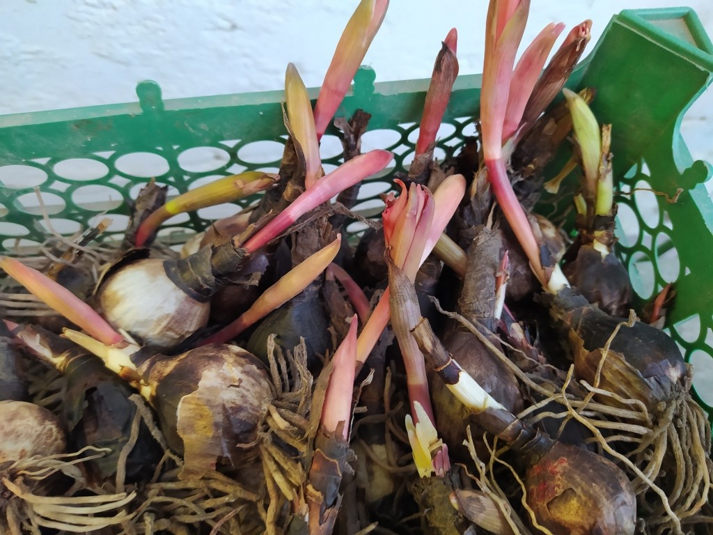 На фото: иногда луковицы начинали прорастать раньше времени. Высаживать было рано из-за заморозков. На фото видно, что из одной луковицы лезет несколько цветоносов