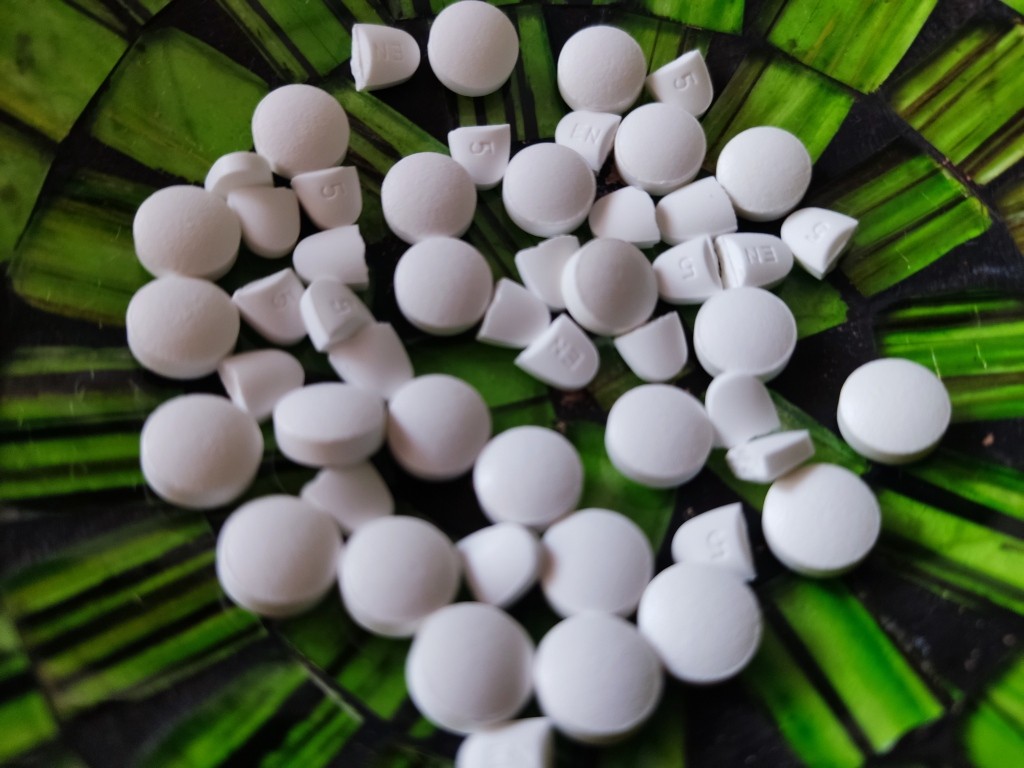 Когда закончился первый месяц, я обнаружила, что в баночке осталось 5 круглых и 12 половинок овальных таблеток.