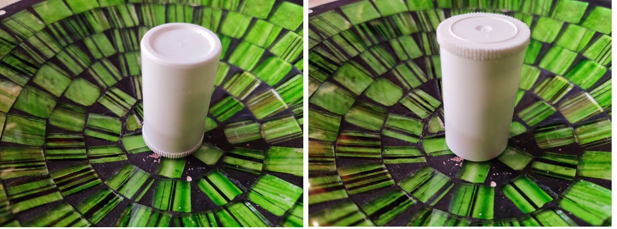 На фото слева: утром выпила таблетку и поставила баночку на крышку. Справа: вечером выпила таблетку и поставила баночку крышкой вверх.