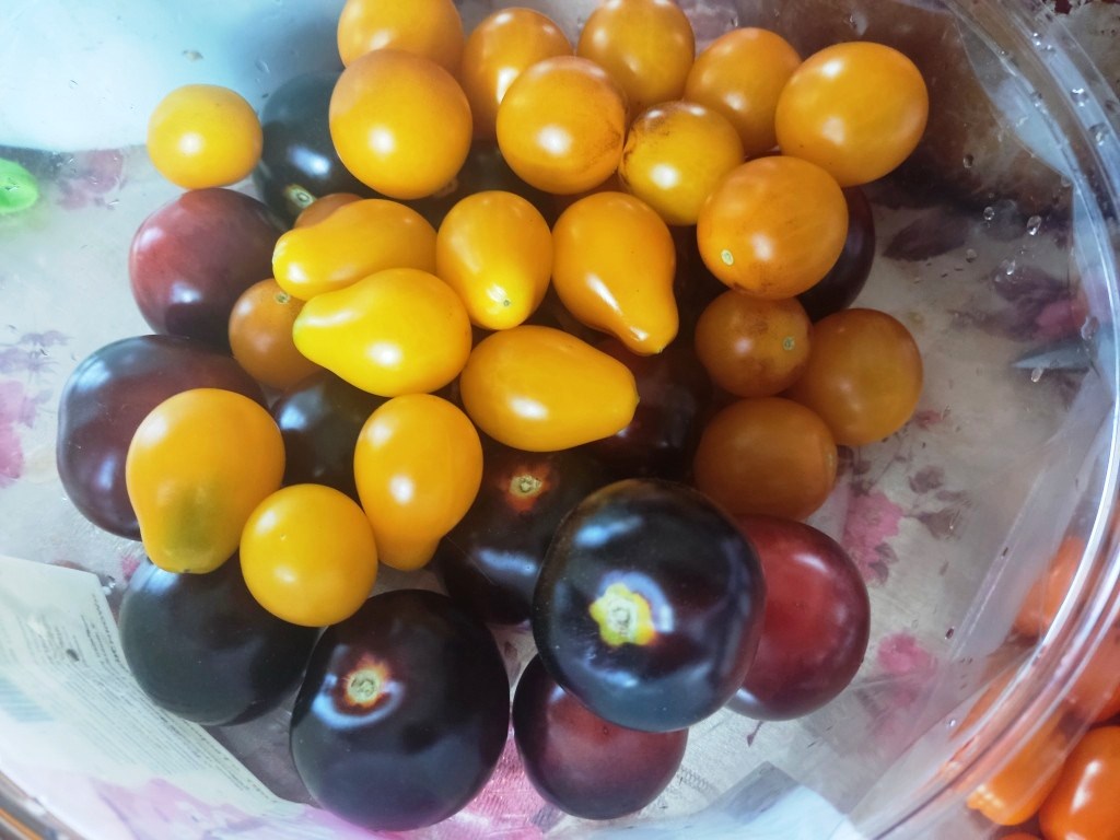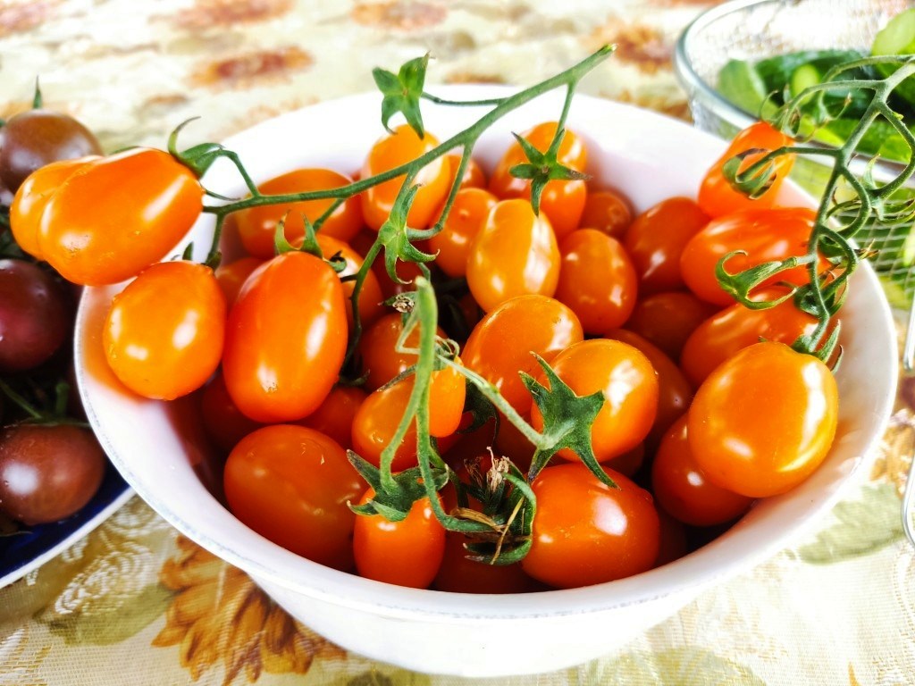 Пришла за помидорами, поскольку у нас было семейное торжество и я поставила на стол наиболее сладкие сорта черри.