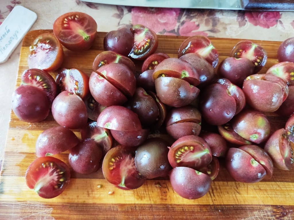 На фото выше крупноплодный сорт Бабушкина Радость, на фото ниже сорт Черный Жемчуг, который резала на сладкие половинки, чтобы достать семена…