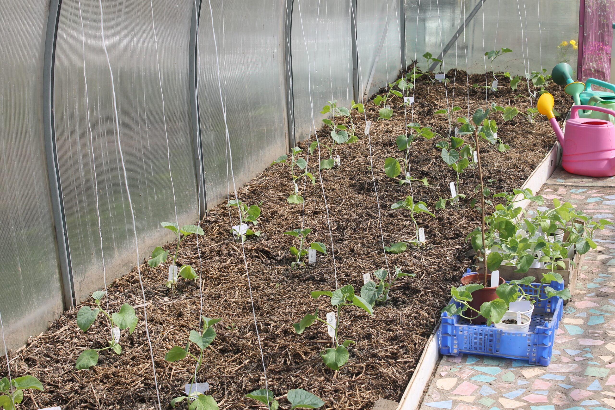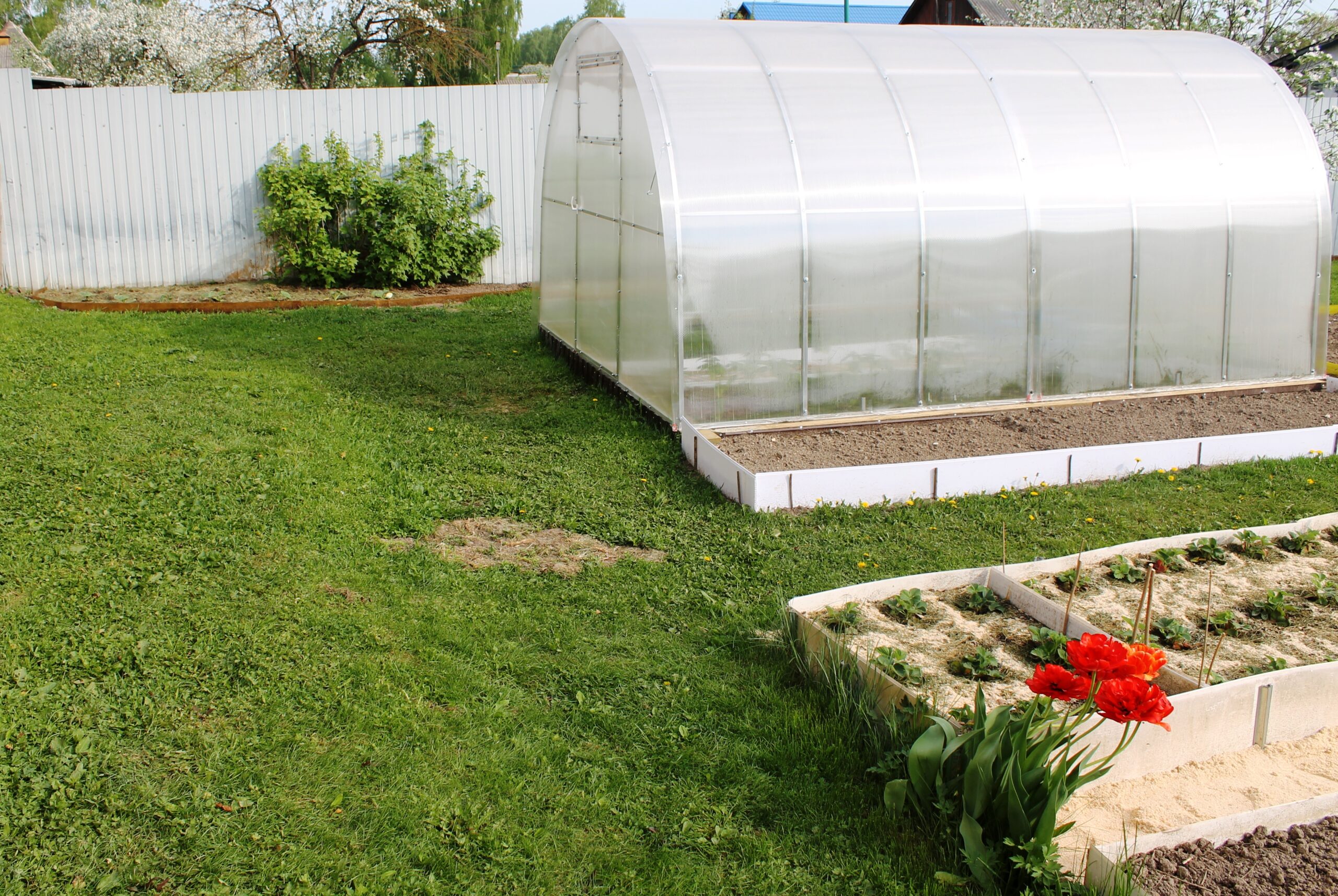 А вот четвертую и пятую теплицы мы не только приподняли над газоном, но и заделали торец поликарбоната.