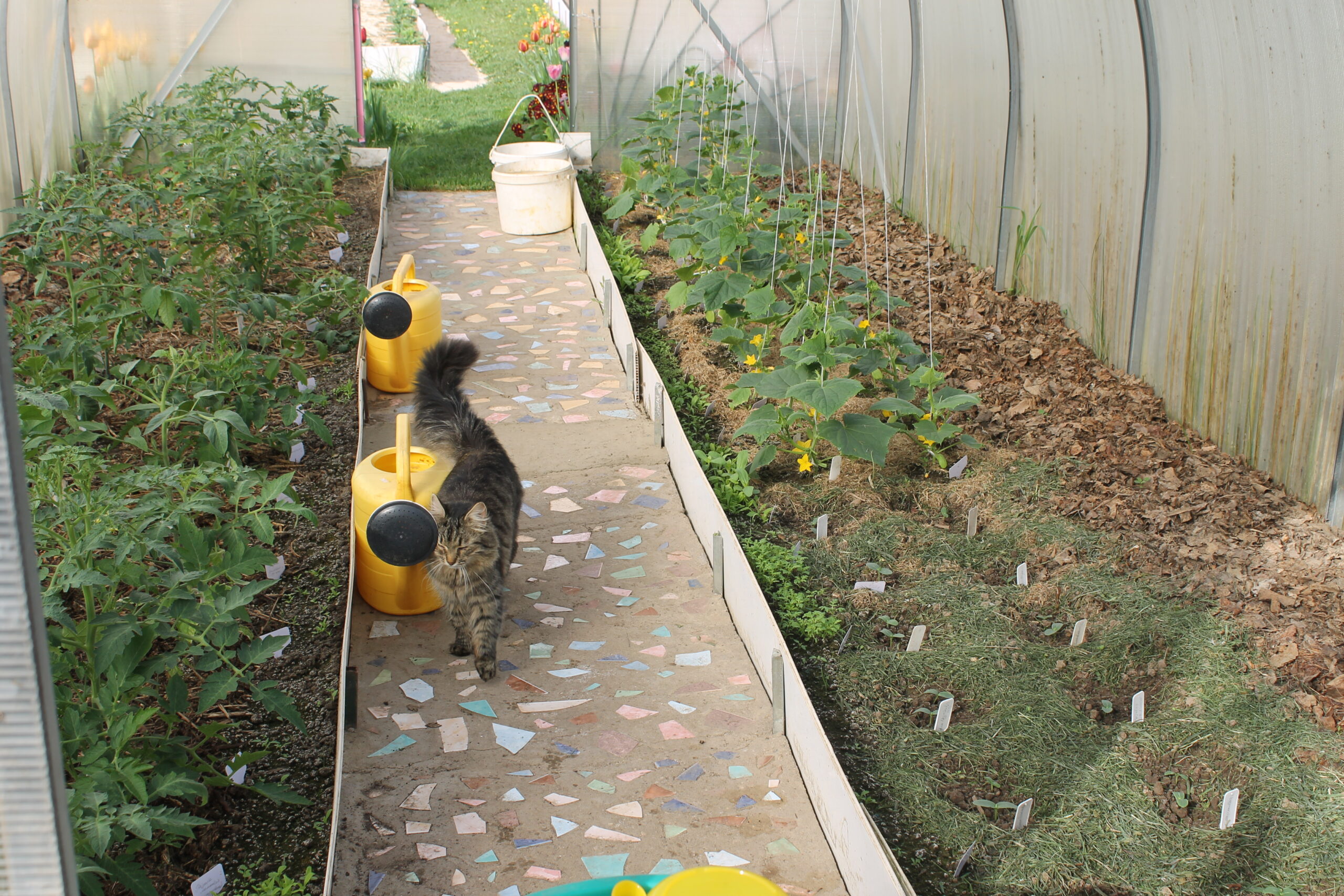 Сначала здесь ничего не было, но потом мы выделили место под картошку, а вокруг теплицы засеяли дорожки газонной травой: